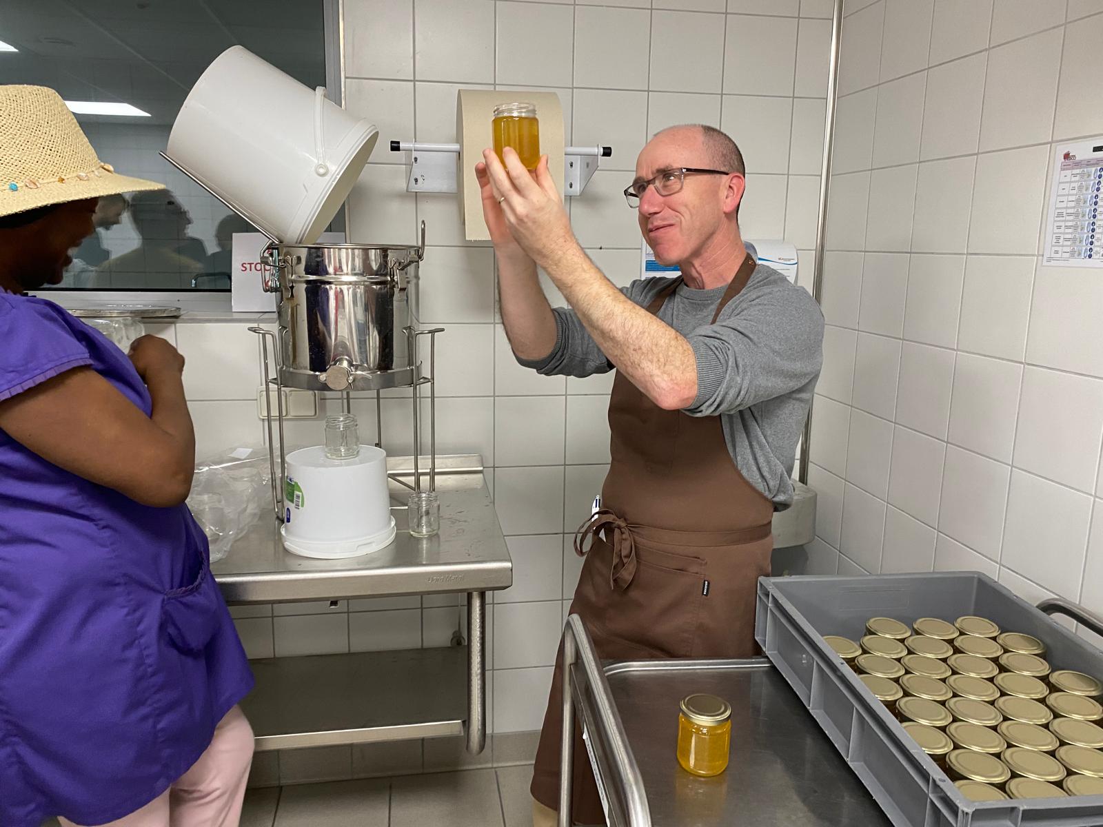 Dans une très belle ambiance, nous avons désoperculé les cadres gorgés de miel, puis procédé à leur centrifugation pour terminer par la mise en pot de ce précieux nectar. Les deux ruches en production ont très bien travaillé en produisant 43 kilogrammes de miel grâce à une météo idéale et une floraison d'acacia parfaite. Nous avons contrôlé la qualité de notre travail en vérifiant au réfractomètre que l'hygrométrie du miel était bien en dessous des 18% requis.