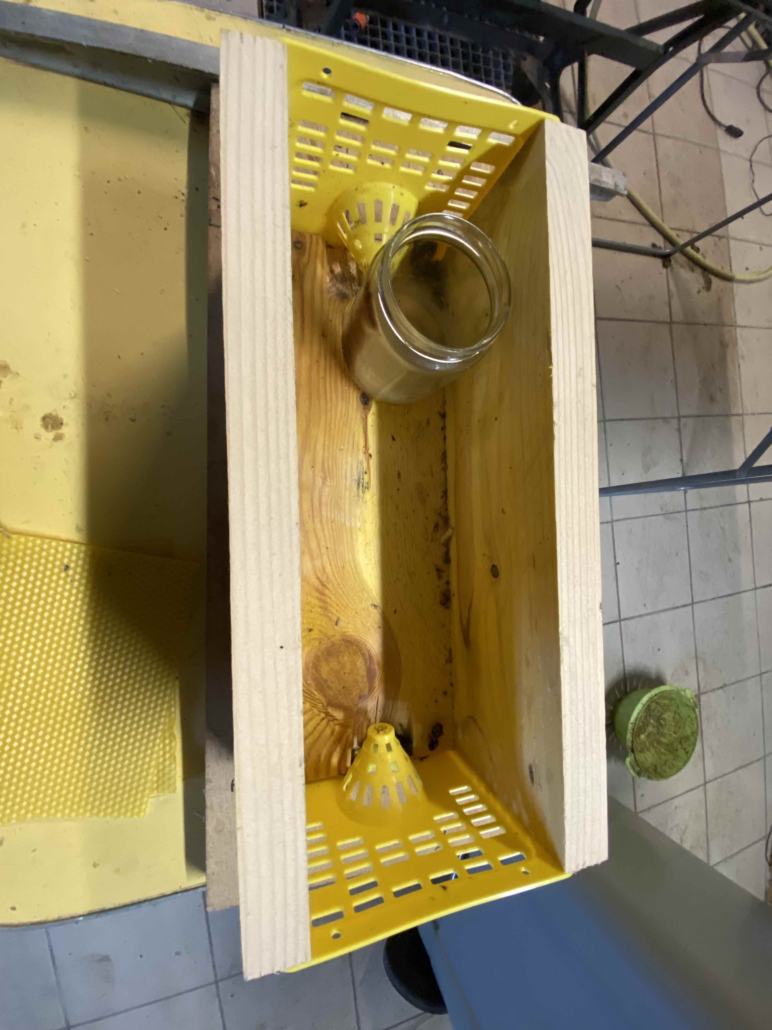 Mettre un pot avec l’appât (bière + Vin blanc + Sirop de cassis). J'avais mis une grille de moustiquaire pour que les frelons ne me vident pas trop vite l'appât mais les frelons ont grignoté la moustiquaire et ont tout bu.