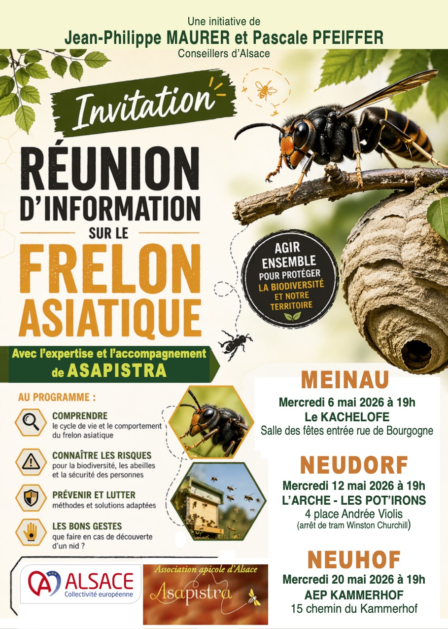 À l’initiative de Jean-Philippe MAURER et Pascale PFEIFFER (Conseillers d’Alsace), Asapistra animera 3 conférences sur le Frelon à Pattes Jaunes (Frelon Asiatique) au mois de mai 2026 :