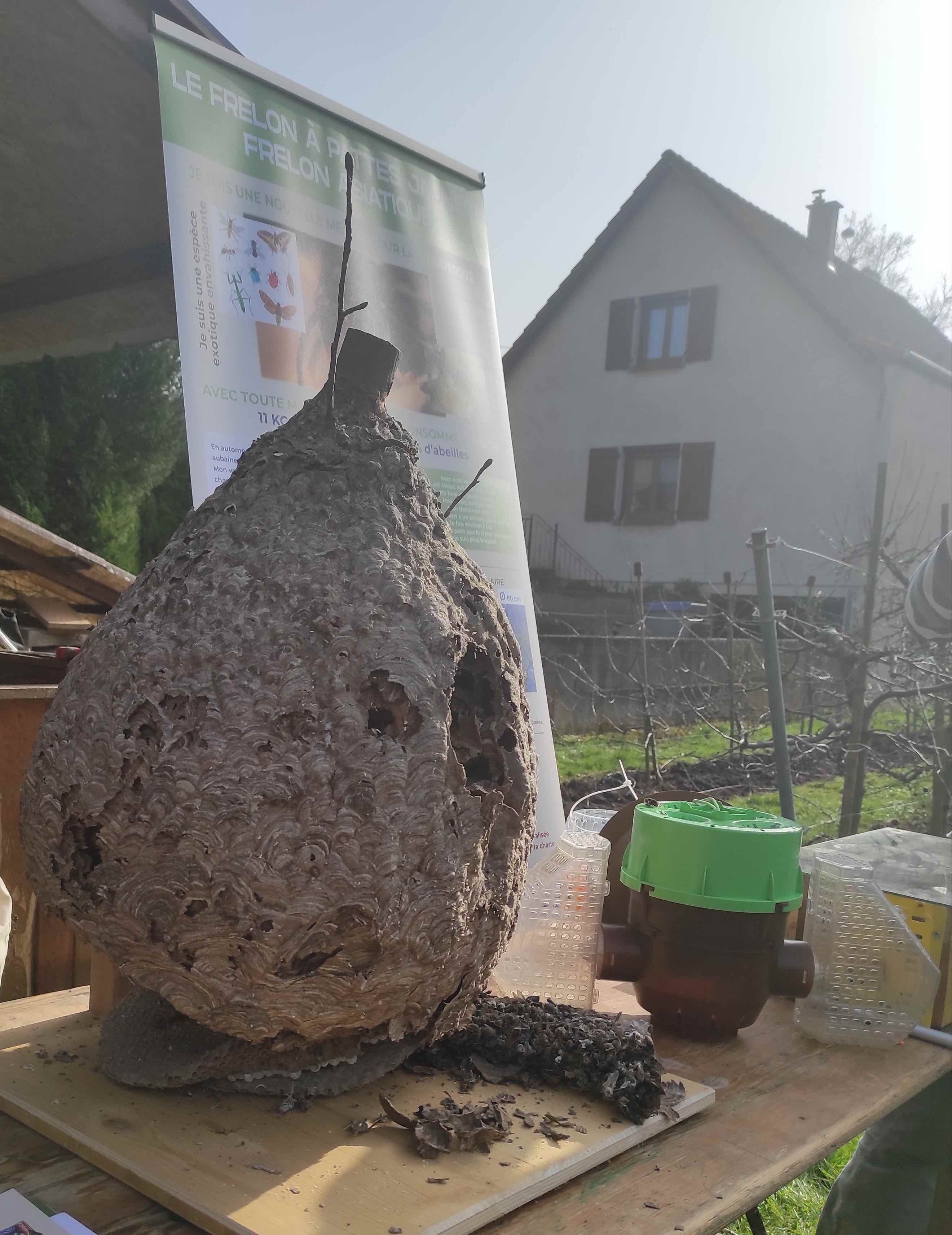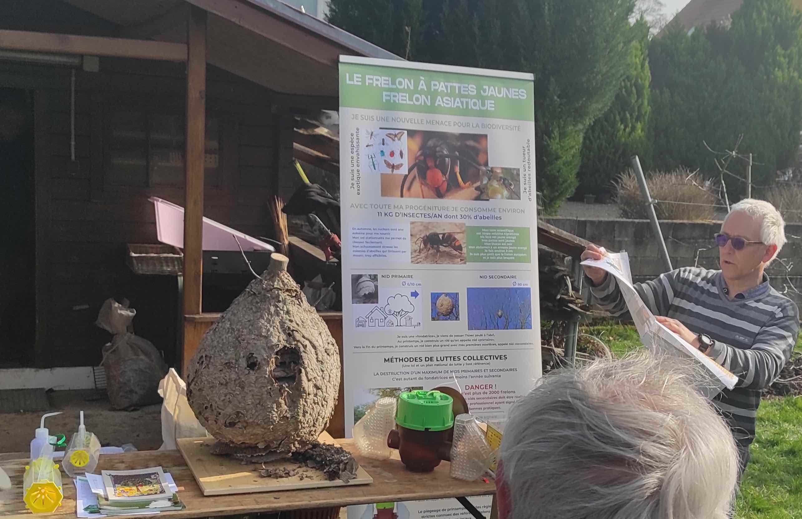 Au programme : présentation de la vie du Frelon, observation d'un nid aimablement fourni par Dard Des Villes et explication des pièges qui servent à capturer les fondatrices et éviter la prolifération de cette Espèce exotique Envahissante (EEE).